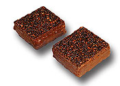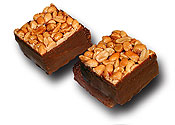 Wafel z masą orzechową posypany prażonymi orzechami arachidowymi i podlany od spodu polewą o smaku czekoladowym. |